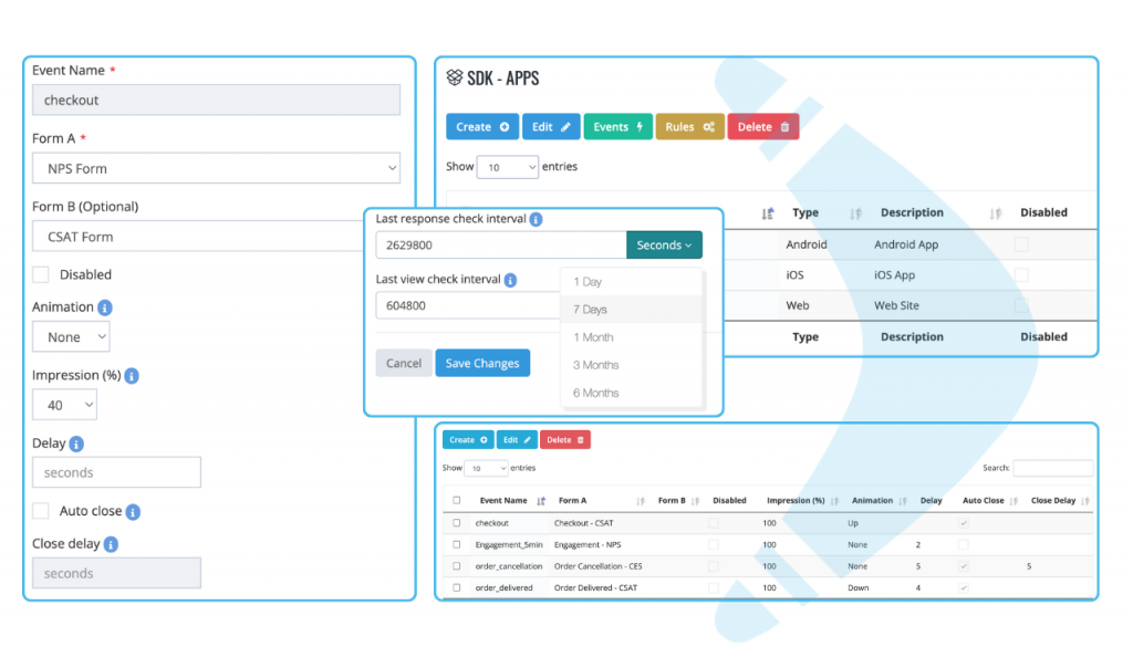 Wiseback’in gelişmiş SDK yönetim paneli ile hangi olayda hangi formun, hangi formatta ve ne sıklıkta gösterileceğini tamamen siz belirlersiniz. Olay bazlı gösterim yoğunluğu, tekrar sıklığı ve zamanlama saniye hassasiyetinde kontrol edilebilir.